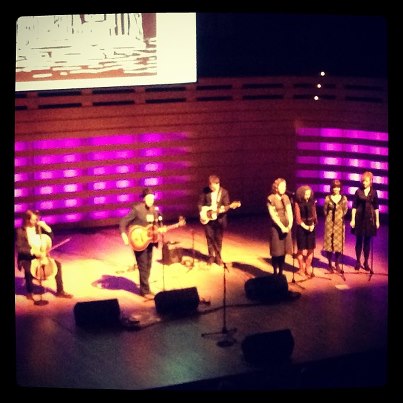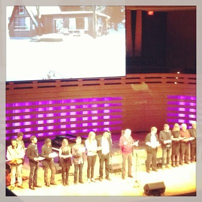 But from my perch in the Green Room, watching the fuzzy screen, or from the wings, I enjoyed the video produced by Brian D. Johnson, then Phil Hall and Karen Solie doing their duet reading of “Shall We Gather at the River,” George Elliott Clarke, as Toronto’s Poet Laureate, reading “In Cabbagetown,” and then the Skydiggers (Andy Maize, Josh Finlayson and Michael Johnstone), who filed off, brushing shoulders with me as the applause from their music still rang around the hall.